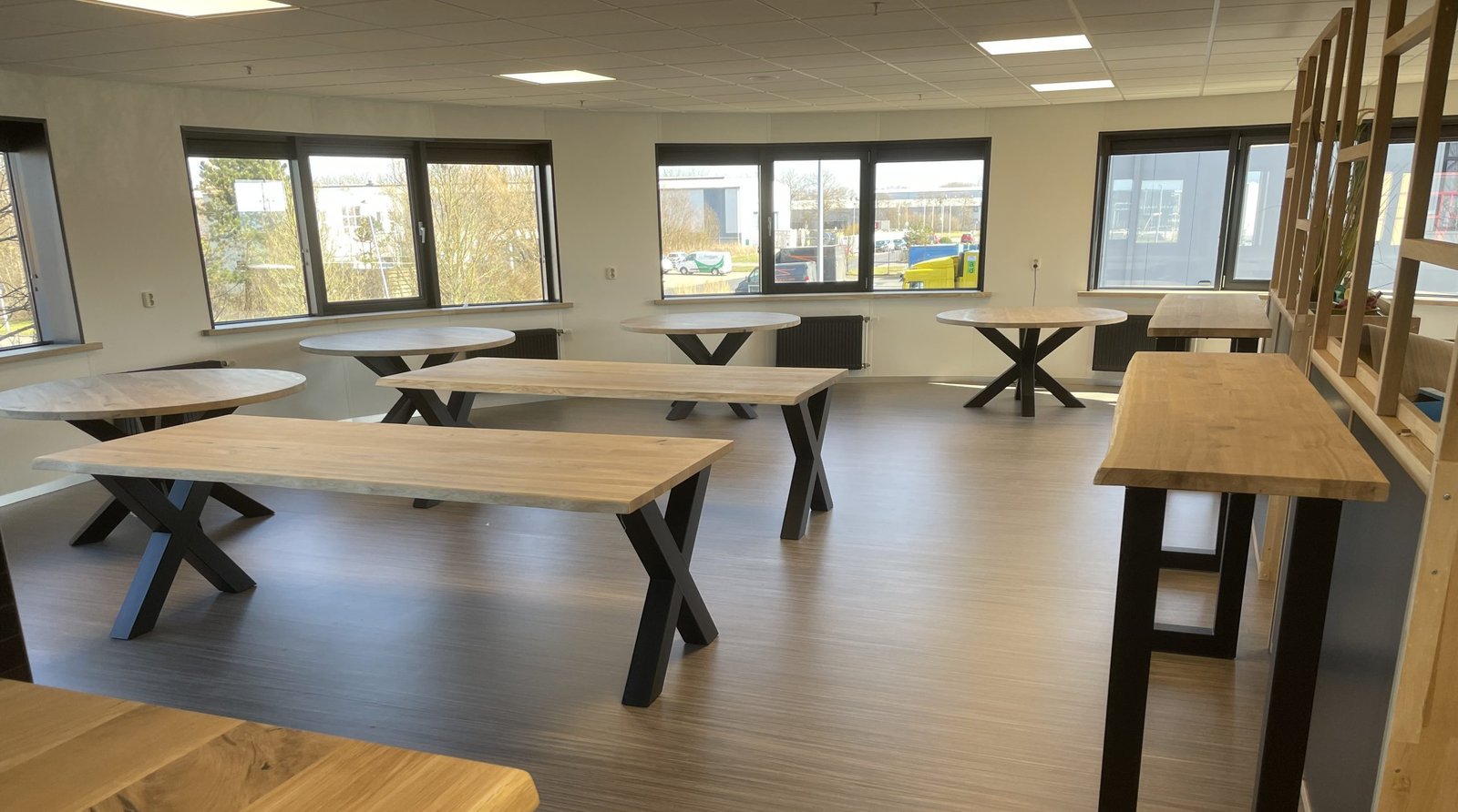 PopulairMassief eiken met stalen onderstel: warm, tijdloos en sterk. Verkrijgbaar in diverse vormen en maten.