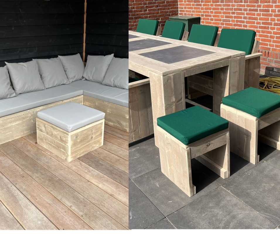 Van Steigerhout hoekbanken tot Douglashouten Tuinsets — alles handgemaakt in onze eigen werkplaats.